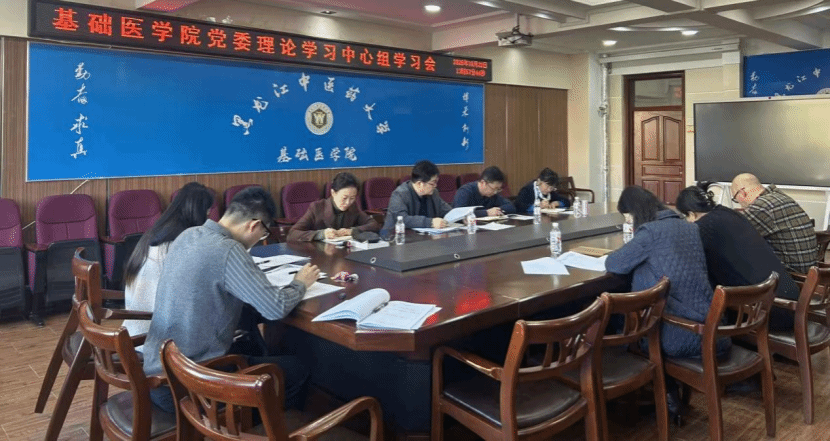 2025年10月22日,基础医学院在研究楼412召开党委理论学习中心组学习会。会议由党委书记刘斌主持,党委理论学习中心组成员参加会议。